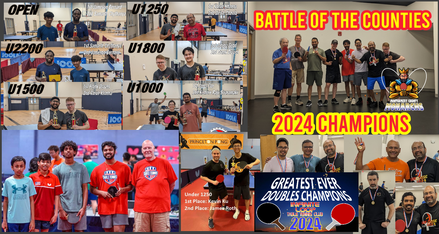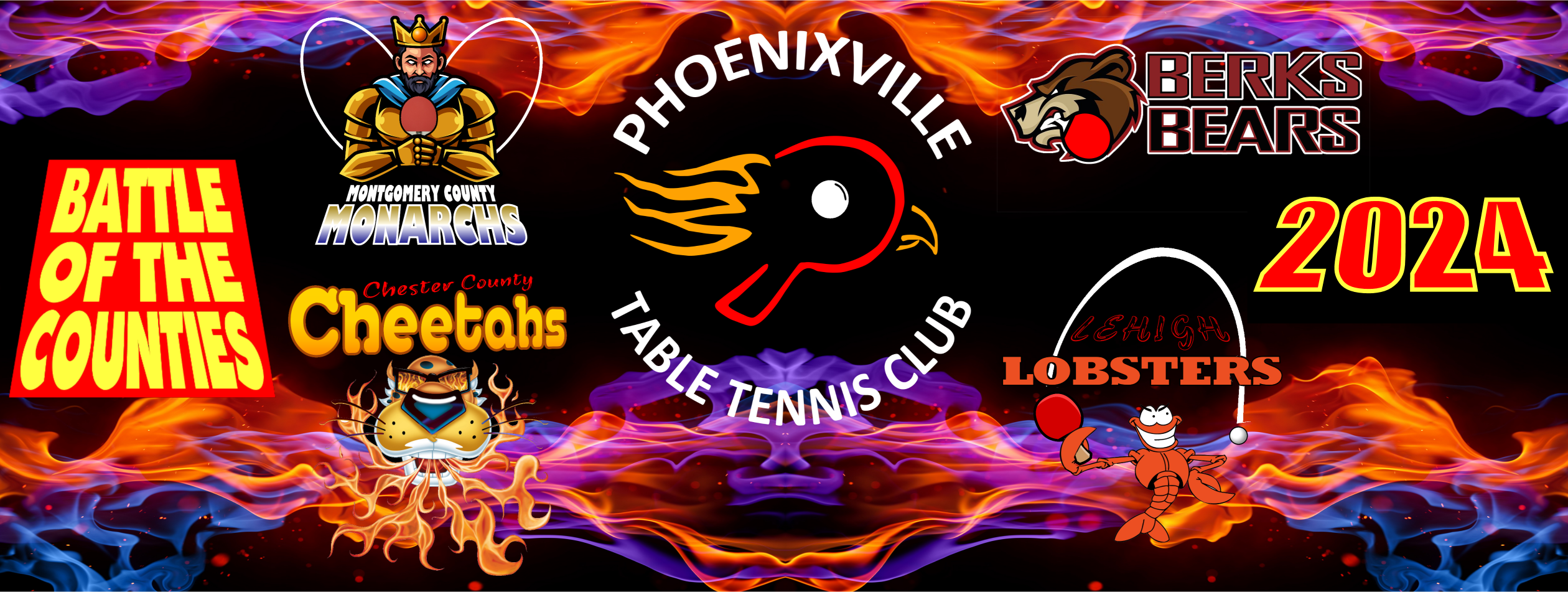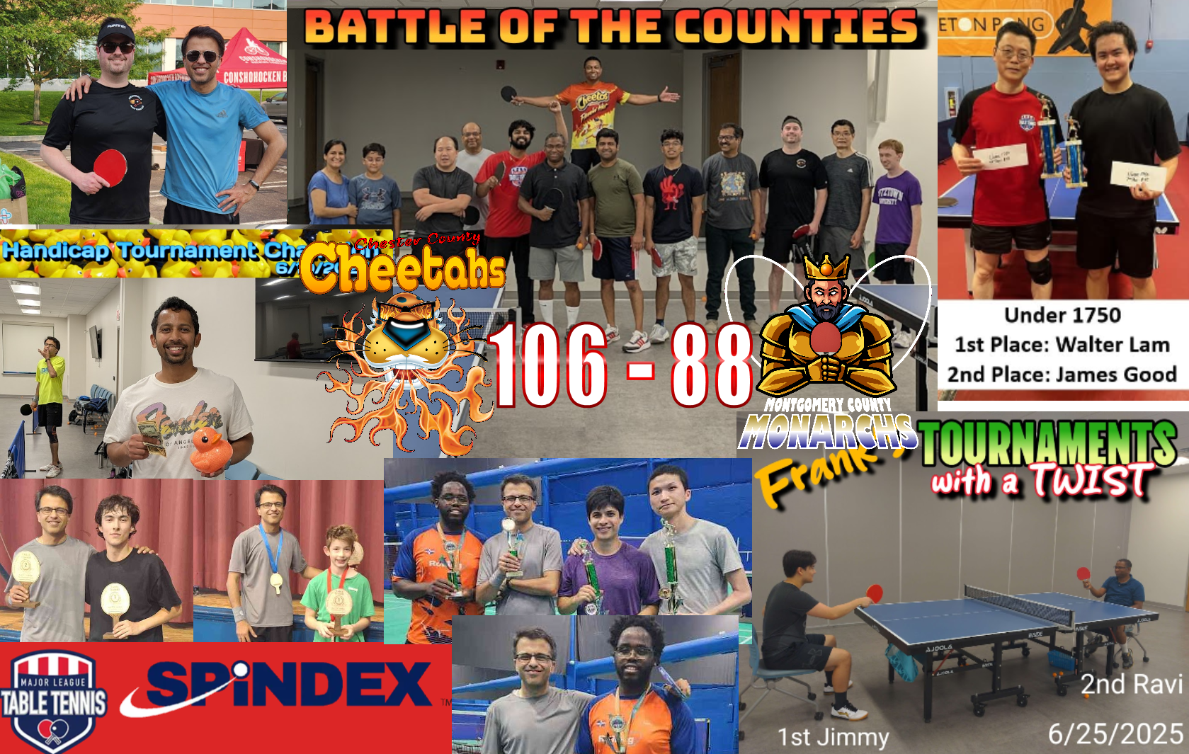 - Battle of the Counties 2025 has begun and will continue through July 22nd. Anyone may participate. We pit residents of Chester County against Montgomery County with outside counties permitted to join a team. As of June 28th, Chester leads 106 to 88. Match photos and score sheets are kept here. A video explanation may be found here. We are using the Major League Table Tennis Spindex rating system during the BOTC. We ask that you sign up here first before participating. You can then track your Spindex rating here. Again, it is FREE.