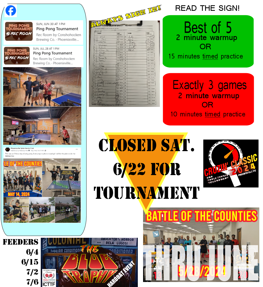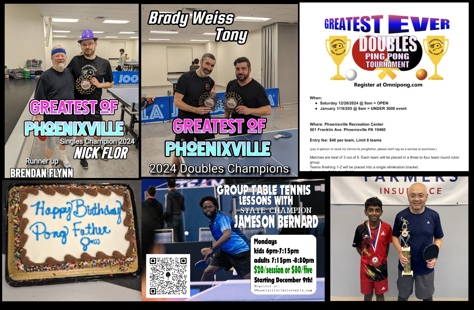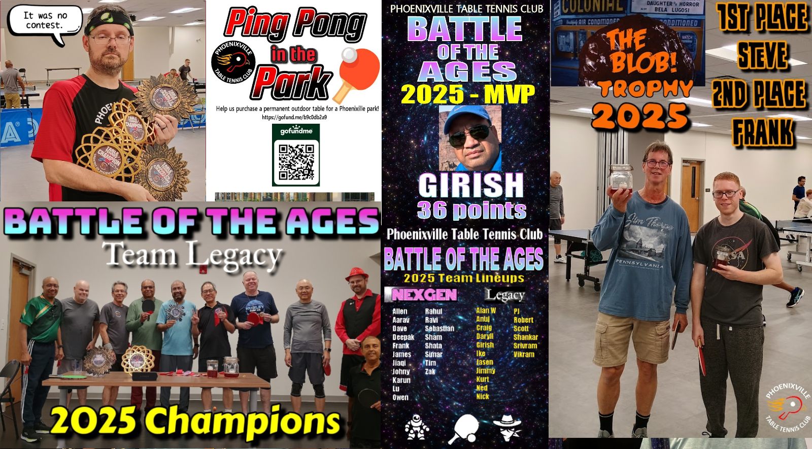 The Greatest of Phoenixville Table Tennis Championship will be held 10/28/2025. This event is for those who live, work or go to school in Phoenixville. (No Girish, if you remote work from Dunkin Donuts, that doesn't count!). The open events requires players to qualify first by winning six matches against six different people at the club between now and the event. Report your wins here. If there are enough participants there will be doubles, ladies, juniors events as well. Only residency restrictions will be required for those events.