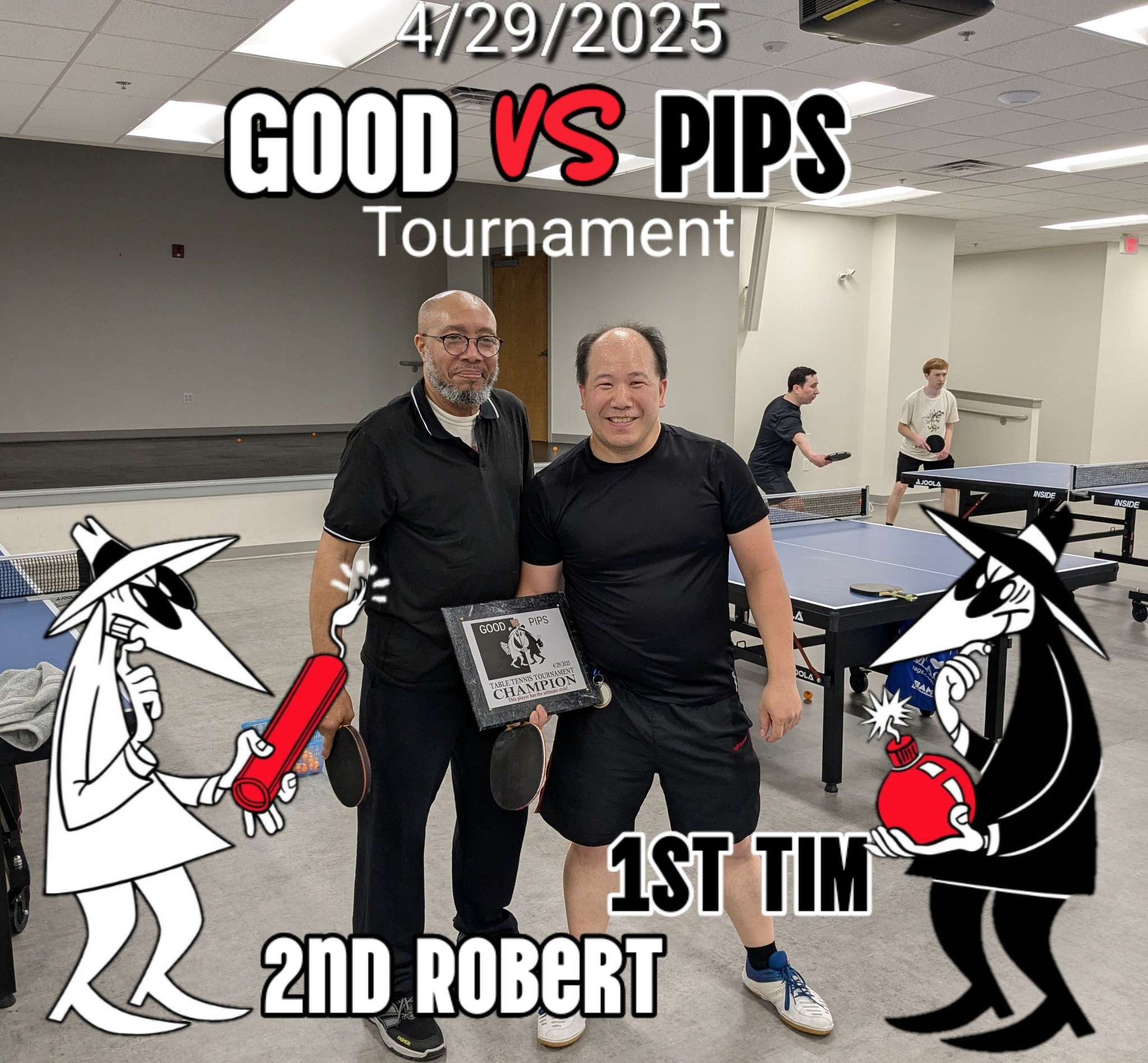 - Saturday 11/15 will be the annual Rahul Kapoor NO PIPS Tournament! This is a single elimination event for the greatest trophy ever! Pips and anti-spin rackets are prohibited from the event! There is also a tournament in Middletown that day held by our friends at RallySpin.com.
