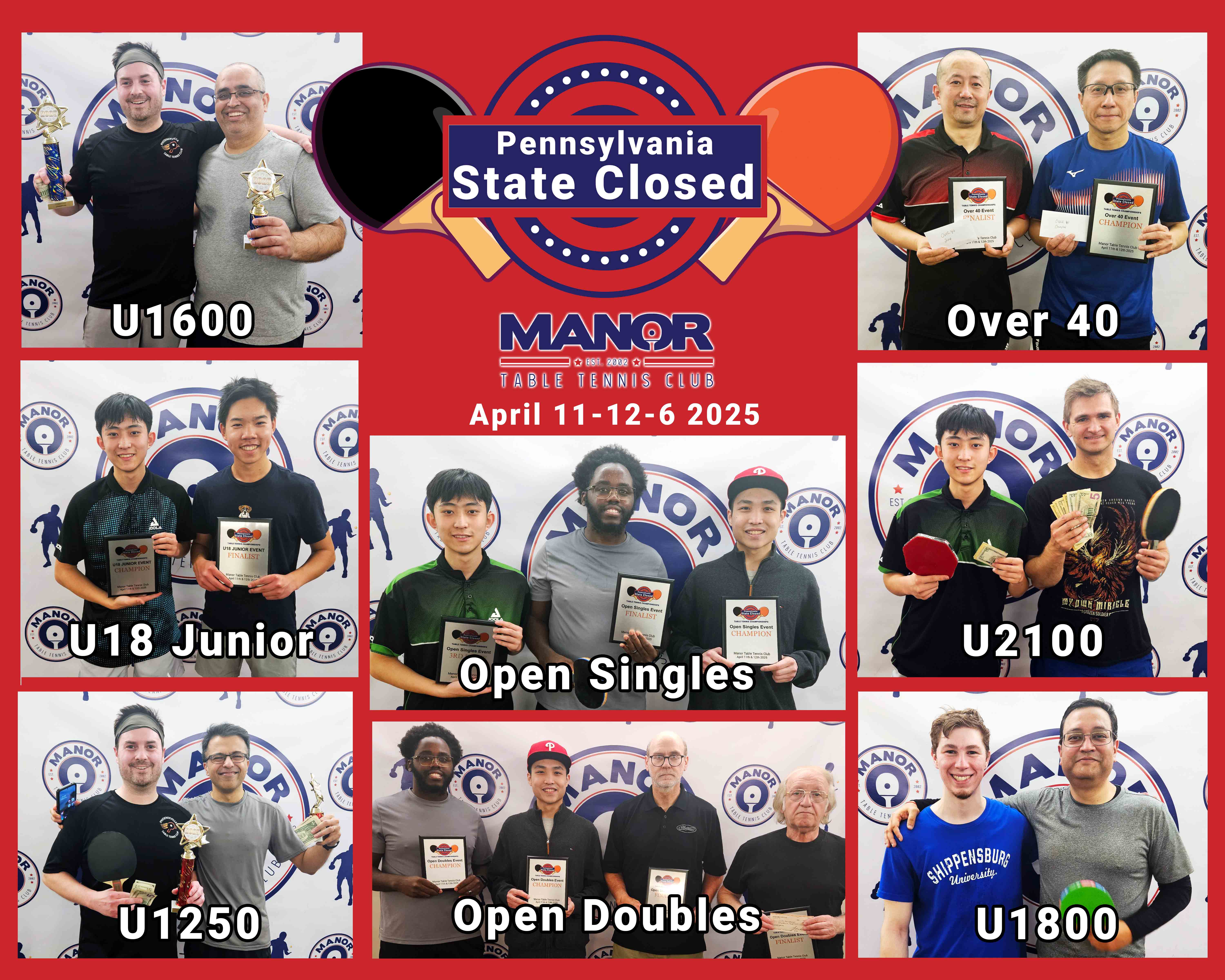 USA Table Tennis has expanded their State Championship Series to include open championships as well as closed. Closed means only PA residents may participate. That is held at Manor in Lancaster this year 4/11 and 4/12.