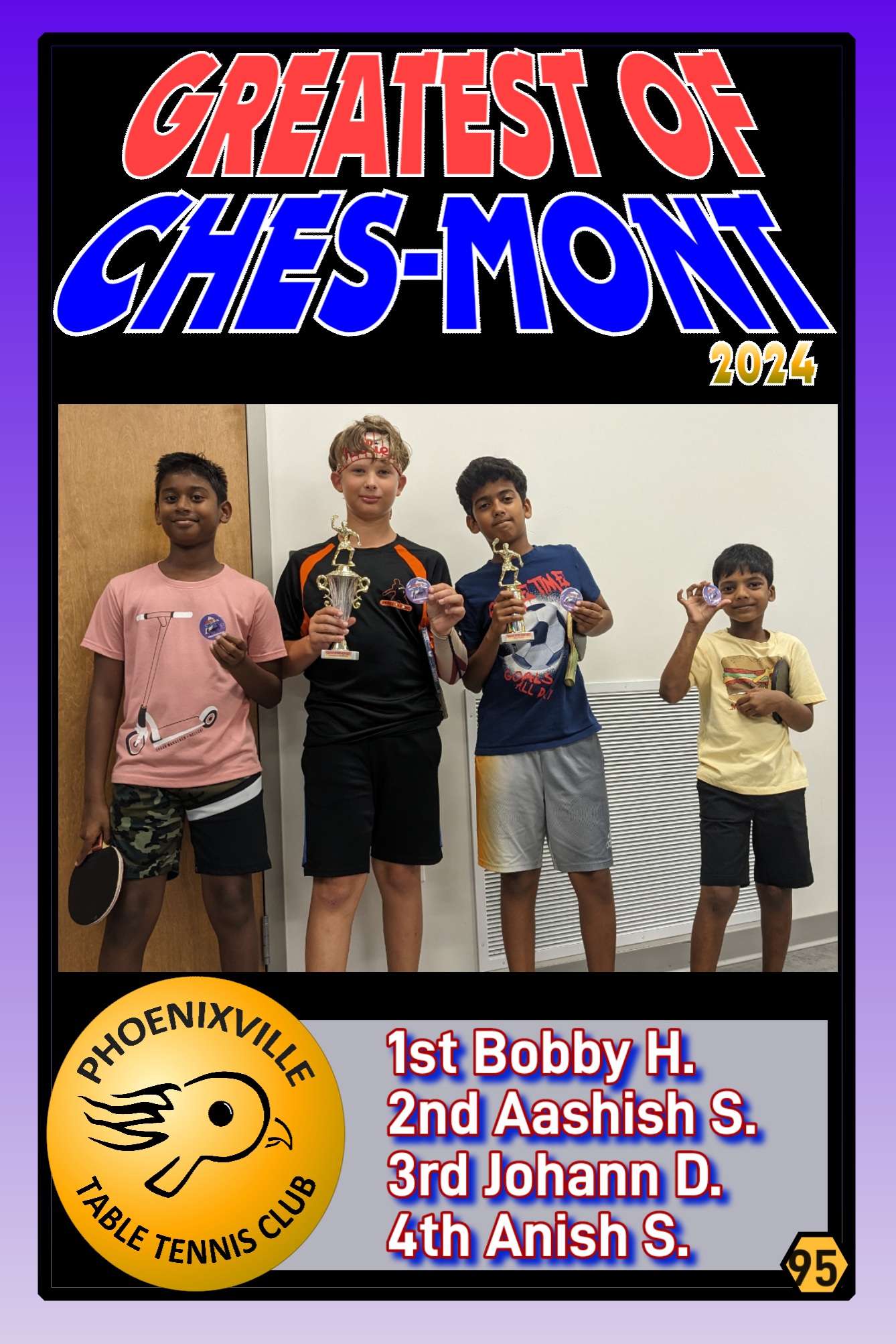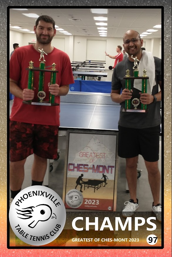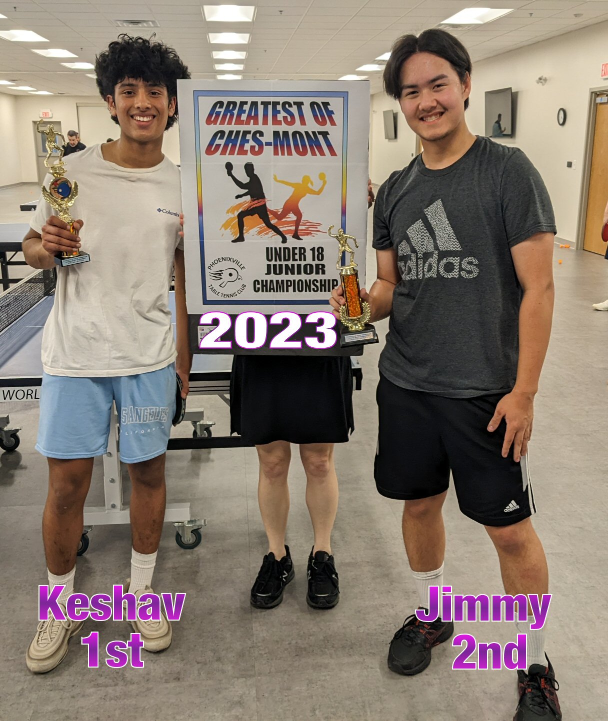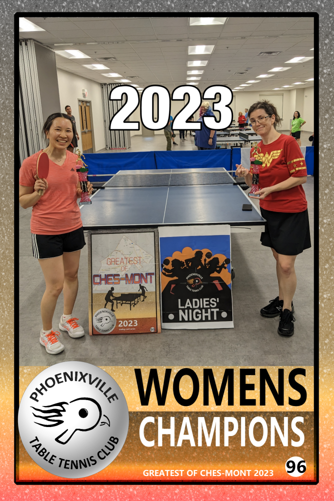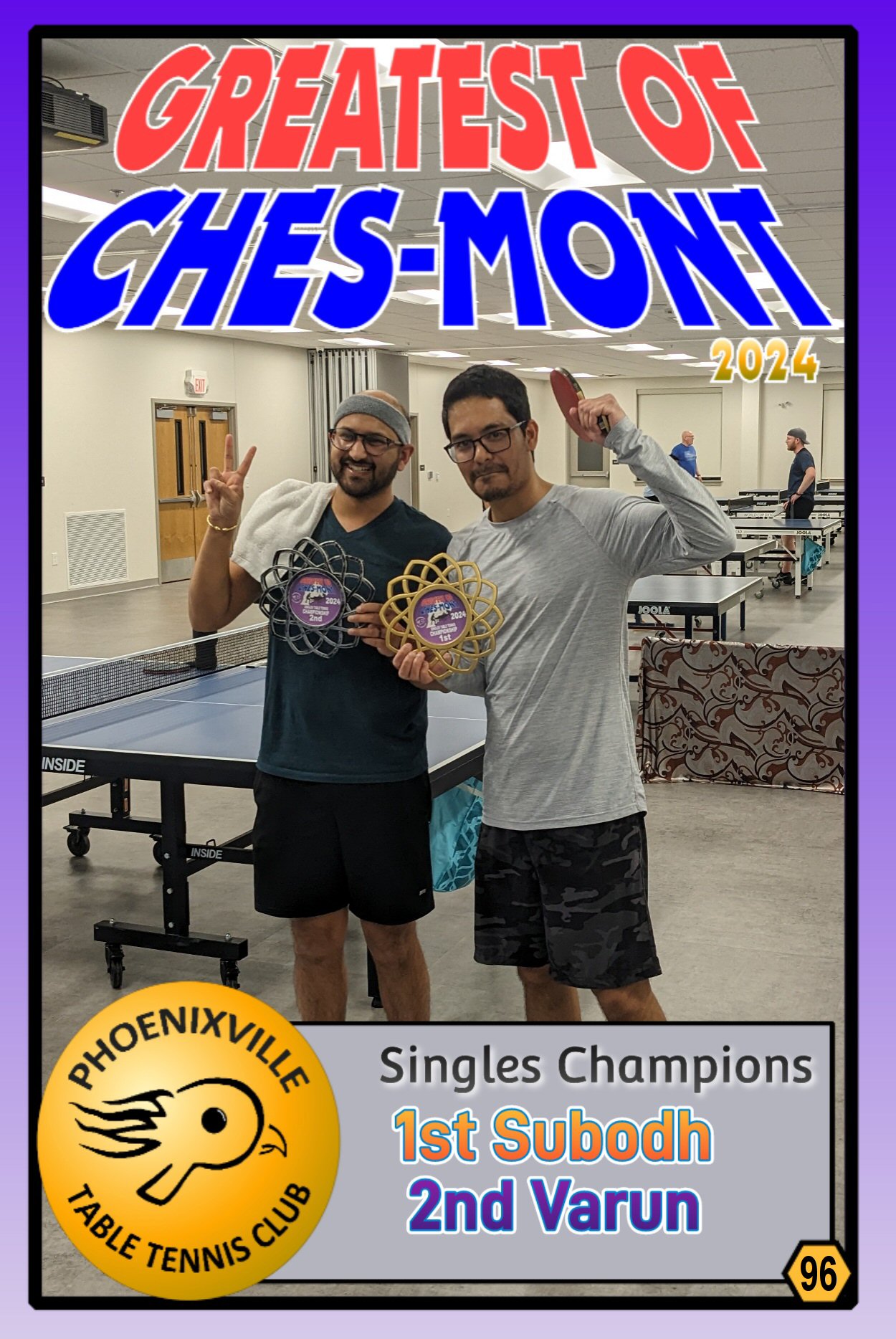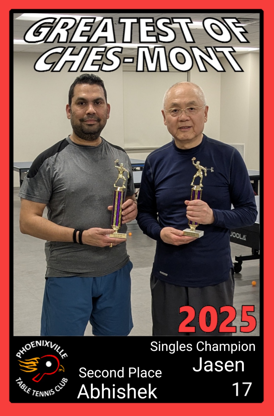 Each spring, starting in 2023, the Table Tennis Championship of the combined Chester and Montgomery counties will be a single elimination tournament, held at the Phoenixville Table Tennis Club. In order to participate, players must live, work, or go to school in Chester or Montgomery Counties of Pennsylvania. Players entering the singles open event must also record six match wins against six different individuals at the club, during open play, during the two months preceding the tournament. In addition to an open, there are juniors, doubles, and a women's divisions. 2026 We have extended the wins to those at Exton Table Tennis Club and Infinite Loop Table Tennis Club.