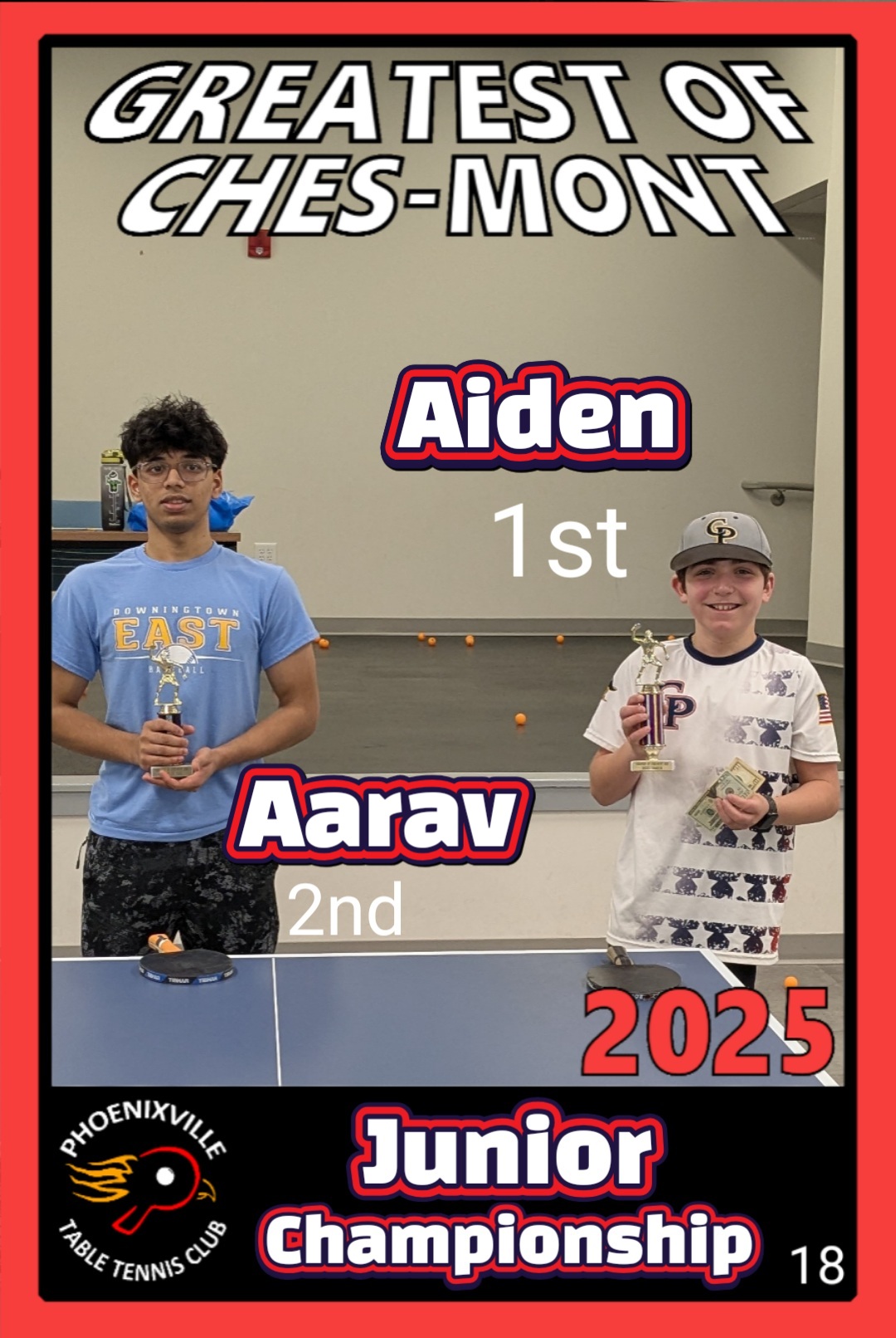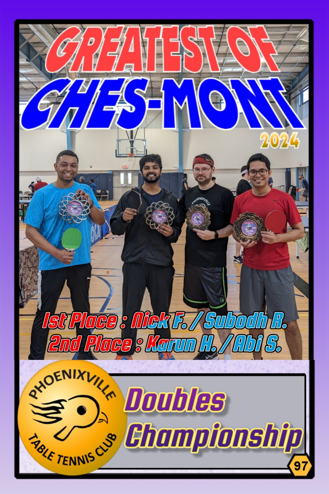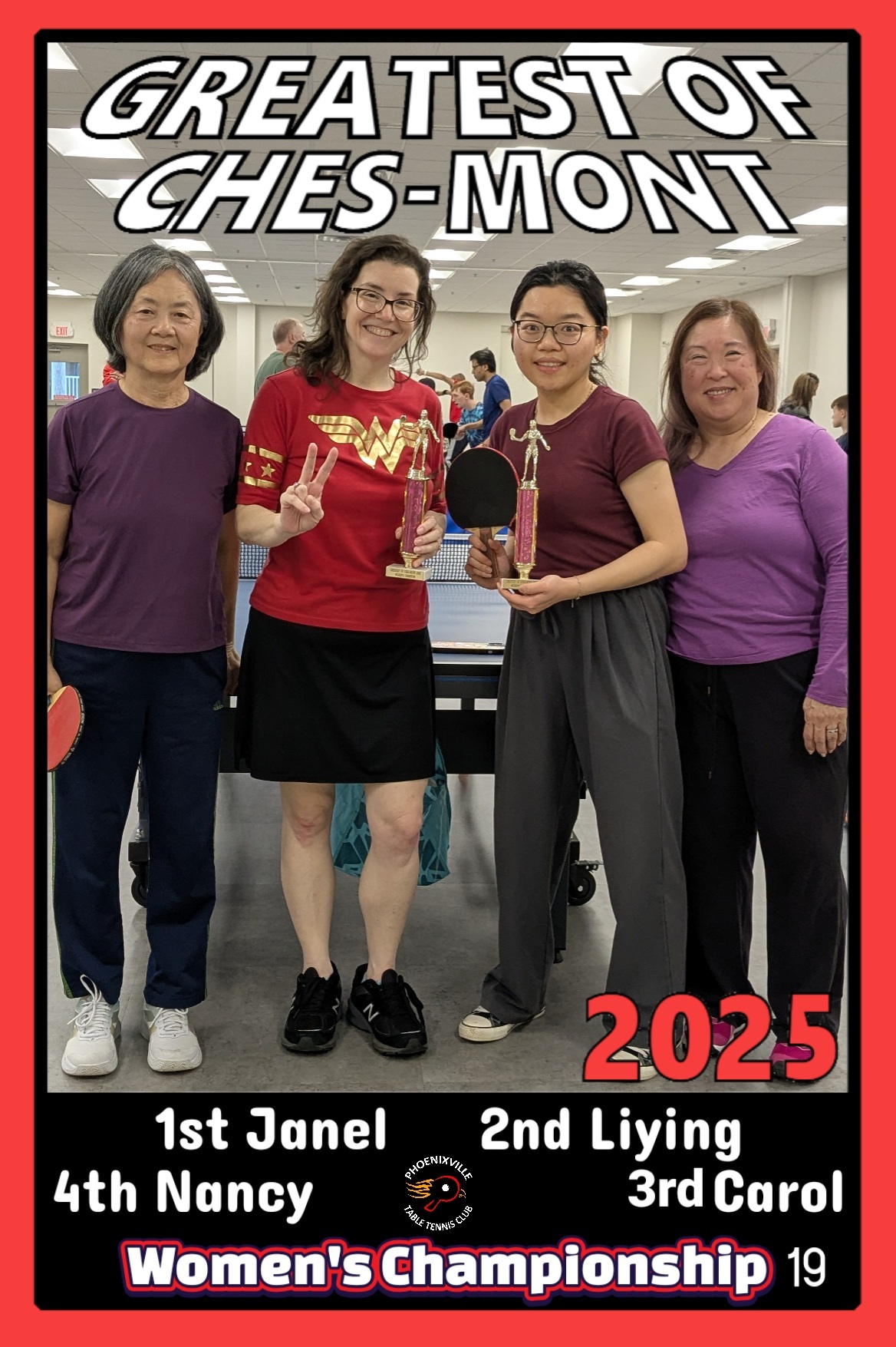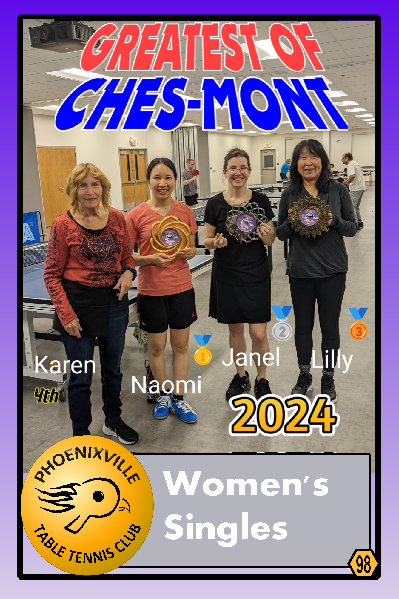 Each spring, starting in 2023, the Table Tennis Championship of the combined Chester and Montgomery counties will be a single elimination tournament, held at the Phoenixville Table Tennis Club. In order to participate, players must live, work, or go to school in Chester or Montgomery Counties of Pennsylvania. Players entering the singles open event must also record six match wins against six different individuals at the club, during open play, during the two months preceding the tournament. In addition to an open, there are juniors, doubles, and a women's divisions. 2026 We have extended the wins to those at Exton Table Tennis Club and Infinite Loop Table Tennis Club.